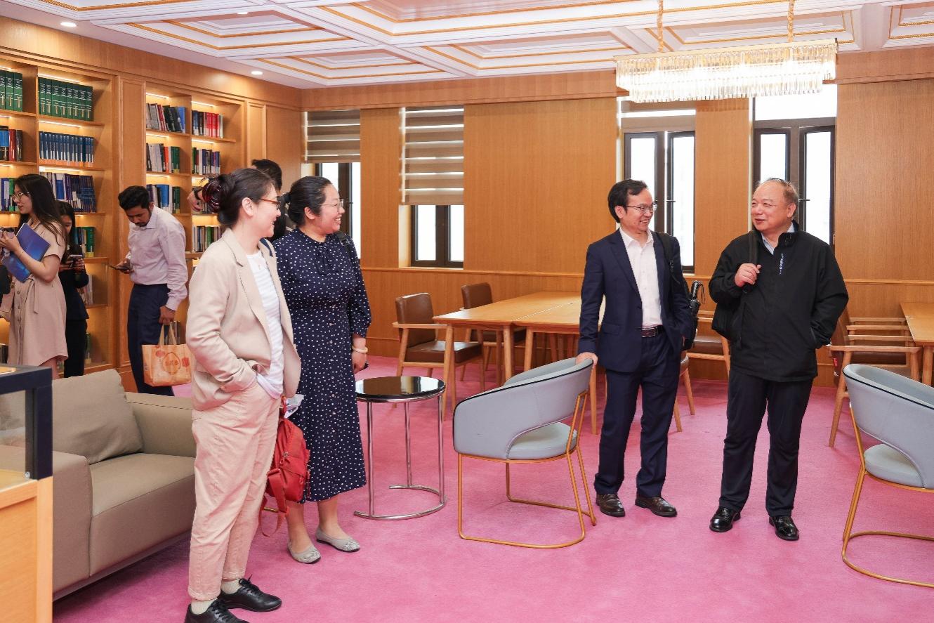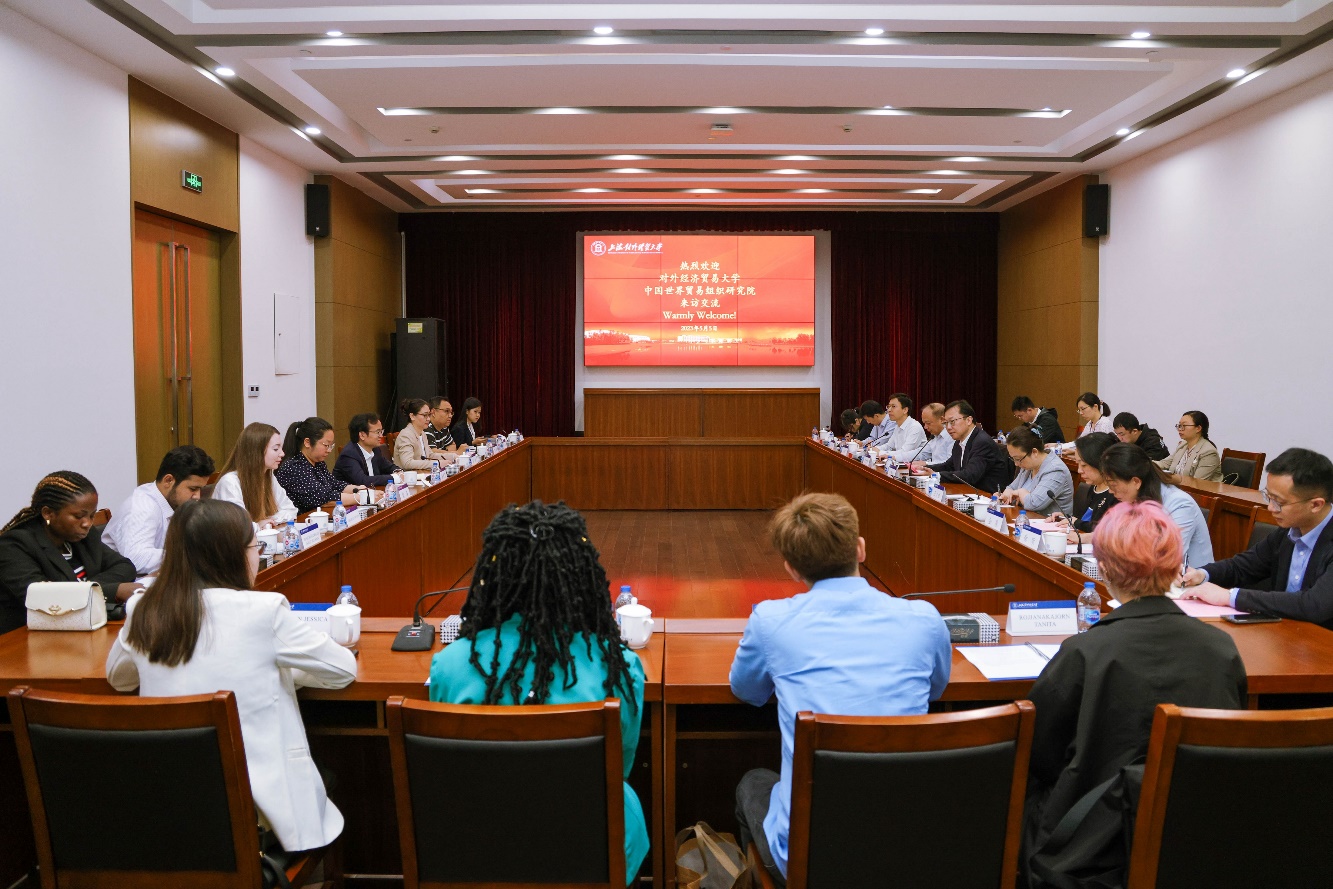 5月5日上午,对外经济贸易大学中国世界贸易组织研究院院长屠新泉、国家对外开放研究院党委副书记高媛、院办主任戴臻、教学教务科主任科员高健及国际留学生一行来必赢626net入口首页古北校区调研交流。校长汪荣明、WTO亚太培训中心主任黄建忠、贸易谈判学院党总支书记王文丽、外事处处长金泉、WTO亚太培训中心执行主任应品广、学校办公室副主任巫雪松、贸易谈判学院党总支副书记商志民、副院长徐昕、国际经济组织系主任王茜及相关教师出席调研座谈会。