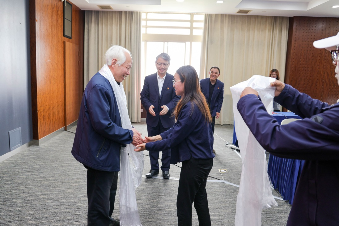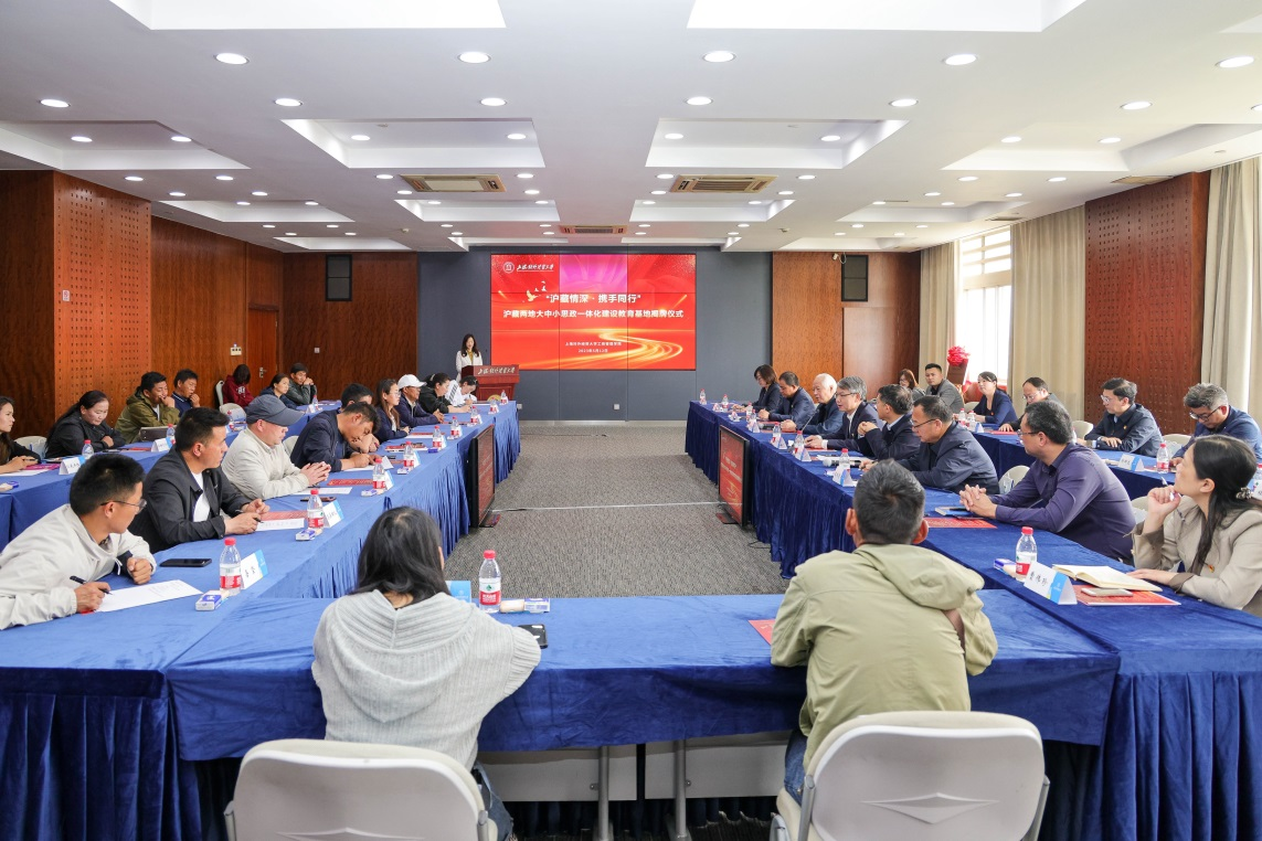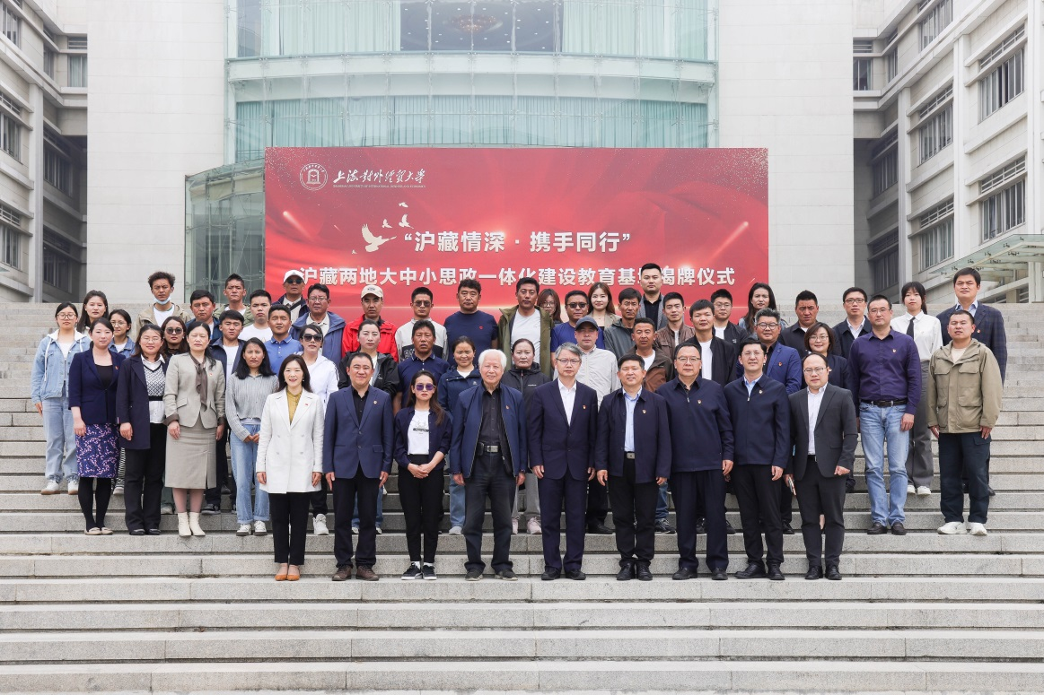 武增勇致欢迎辞,对松江区、西藏定日县各中小学教师代表的到来表示热烈的欢迎。祁明、郭宁伟、金永发、汪海鲸共同为上经贸大工商管理学院沪藏两地大中小思政一体化建设教育基地揭牌。索朗白吉为祁明和金永发献上洁白的哈达,表达西藏师生心中最诚挚的祝福。
