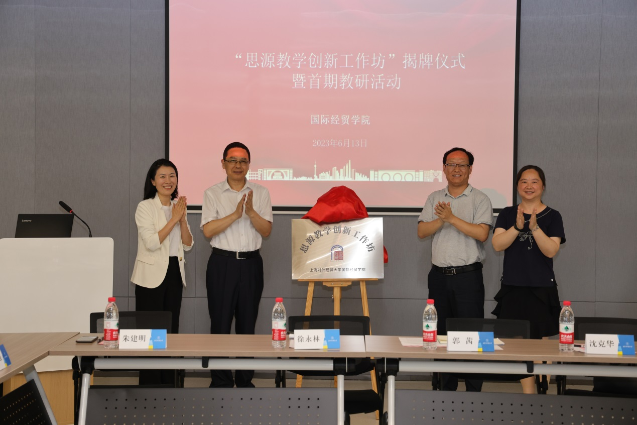 在揭牌仪式上,徐永林、朱建明与郭茜、沈克华,共同为“思源教学创新工作坊”揭牌。