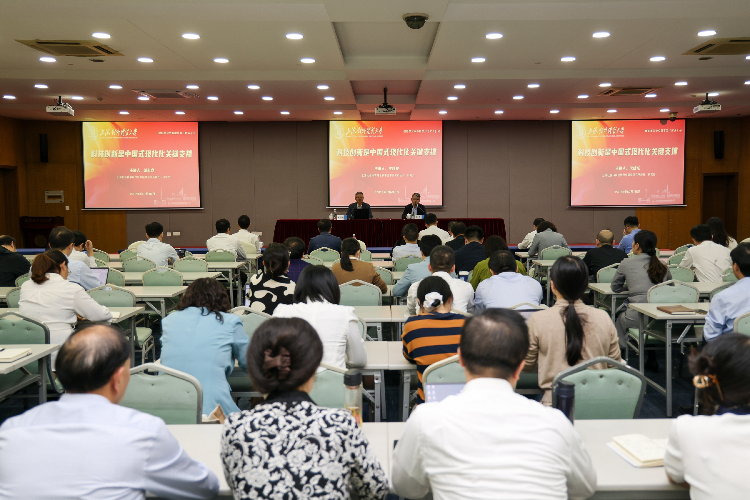 为深入学习习近平新时代中国特色社会主义思想和党的二十大精神,全面理解和准确把握习近平总书记关于科技自立自强的重要论述,10月10日下午,学校在信息楼526报告厅举行中心组学习(扩大)会,邀请上海社会科学院世界中国学研究所所长沈桂龙研究员作主题为“科技创新是中国式现代化关键支撑”的专题辅导报告。报告会由校党委副书记、副校长祁明主持。