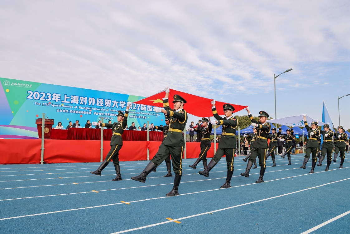 伴随着《运动员进行曲》激昂而热烈的乐声,仪仗队手擎国旗、会旗及校旗登场,他们的步伐铿锵有力,他们身姿俊逸,神情坚毅,展现了上经贸大人奋力拼搏的精神风貌,踏出了新时代青年同时代向前的坚定步伐。全校各方阵相继入场,鲜花方阵彰显上经贸大学子的青春朝气,红旗方阵以飘扬的中国红点亮开幕式,各学院部门的师生代表方阵更是各具特色、各展风华,尽显上经贸大师生昂扬向上的风采和精神风貌。