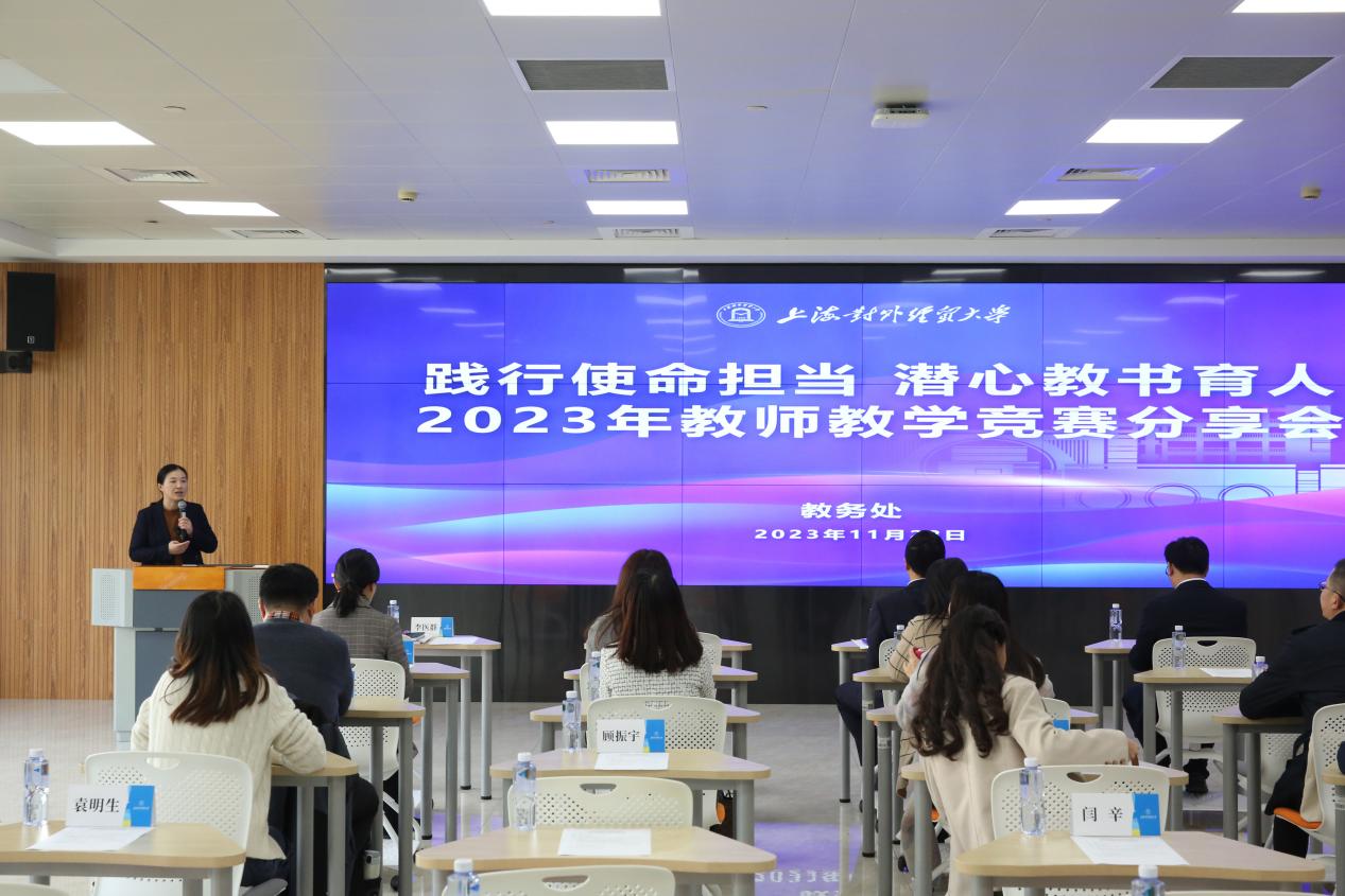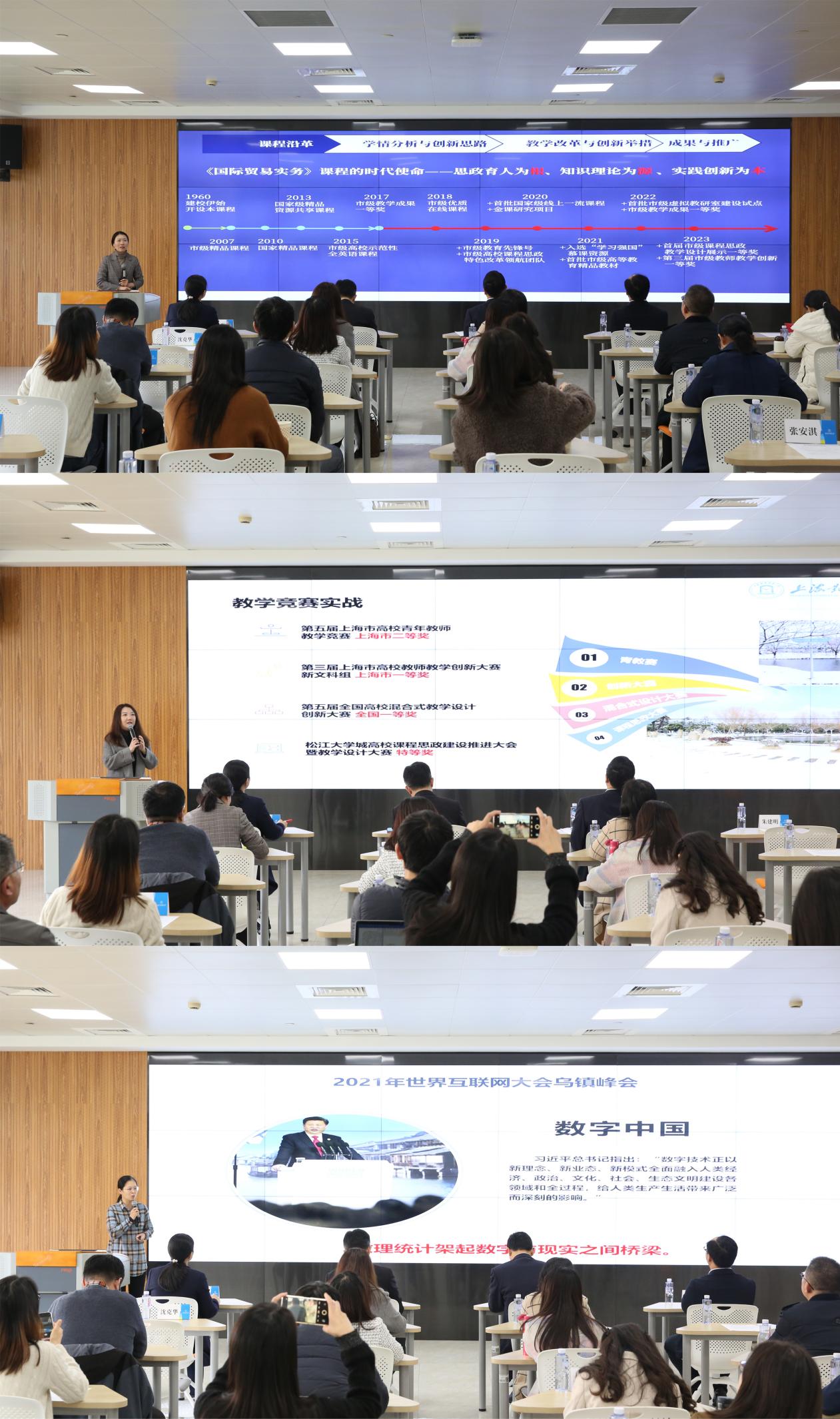 会上,第三届上海市高校教师教学创新大赛一等奖获奖教师沈克华、第五届全国高校混合式教学设计创新大赛一等奖获奖教师肖鸾仪、首届中国高校财经慕课联盟“同课异构”课程思政教学竞赛一等奖获奖教师董平分别作了“‘思政育人为根、知识理论为源、实践创新为本’—《国际贸易实务》教师教学创新实践交流”“‘以赛促教产学融合’混合式教学设计经验分享”“《数理统计》课程思政教学竞赛体会”的主题分享。