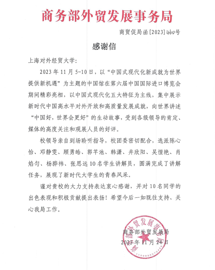 近日,学校收到商务部外贸发展事务局寄来的感谢信,对学校选派的第六届中国国际进口博览会国家展中国馆10名学生讲解员表示衷心感谢,表扬了讲解员们的出色表现。