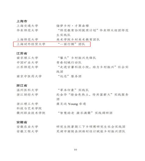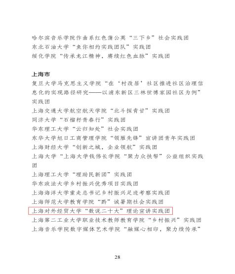 近日,团中央通报表扬一批在2023年全国大中专学生志愿者暑期文化科技卫生“三下乡”社会实践活动中表现突出的优秀团队和项目。“‘数说二十大’理论宣讲实践团”获评“三下乡”社会实践优秀团队、“以数赋能,跨境出海——基于上海自贸区的高标准数据合作场景调研”获评“三下乡”“返家乡”社会实践优秀调研报告、“‘一面行傩’团队”获评“三下乡”乡村振兴“笃行计划”专项行动优秀实践团队。此外,“探‘水之语’,承‘指之技’——贵州三都水族非遗的调研与传承” “推进健康中国建设,回顾沪医援滇十年项目”分别获评由中国青年报社主办的“全国大学生暑期社会实践项目TOP100”和大学生社会实践成果“千校千项”网络展示活动优秀项目。在2023年“知行杯”上海市大学生社会实践大赛,学校荣获二等奖3项、三等奖4项。