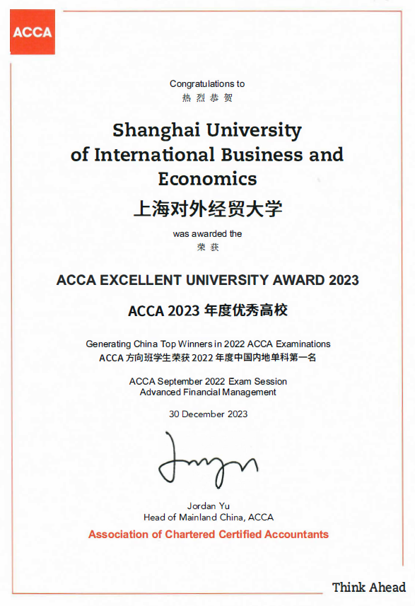 ACCA是全球最大的国际会计师组织之一,为成员提供全球通行的会计资格认证。ACCA的评选标准高严格,需要候选高校在学术水平、师资力量、教学质量等方面表现出卓越的表现。2023年度,学校能够再次获得ACCA全国优秀高校称号,充分体现了学校在ACCA国际认证领域的卓越贡献。2010年起,会计学院开始面向优秀本科生开设ACCA (特许公认会计师)方向班,2013年获ACCA最高白金级认证,成为全国第六所获得ACCA总部认可白金级认证资格的院校,2018年荣获“ACCA中国卓越教育机构成就奖”。2015年、2017年、2018年、2019年被评为ACCA全国优秀高校,本次为第5次获得该殊荣。截至目前,必赢626net入口首页在ACCA项目中已获得1个全球单科第一、9门次单科全国第一和3门次ACCA方向班全国通过率第一,4名教师获得全国“ACCA优秀专业指导教师”称号。