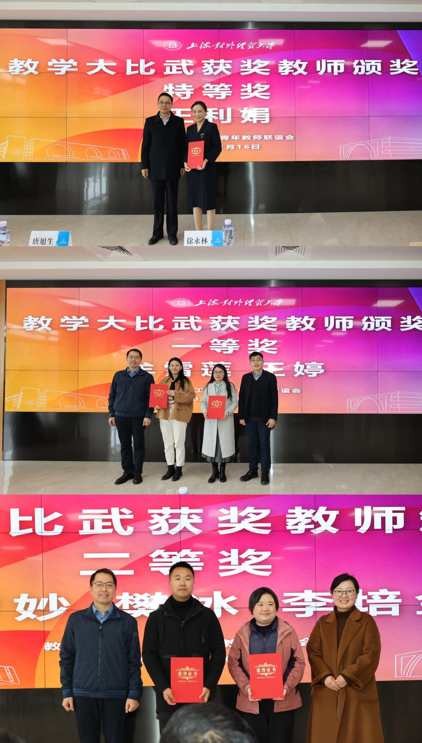 副校长徐永林、校工会常务副主席唐旭生、人事处副处长(党委教师工作部副部长)张莉莉、青年教师联谊会理事会理事长王春雷分别为6位在“教学大比武”中获奖的学员颁发获奖证书。