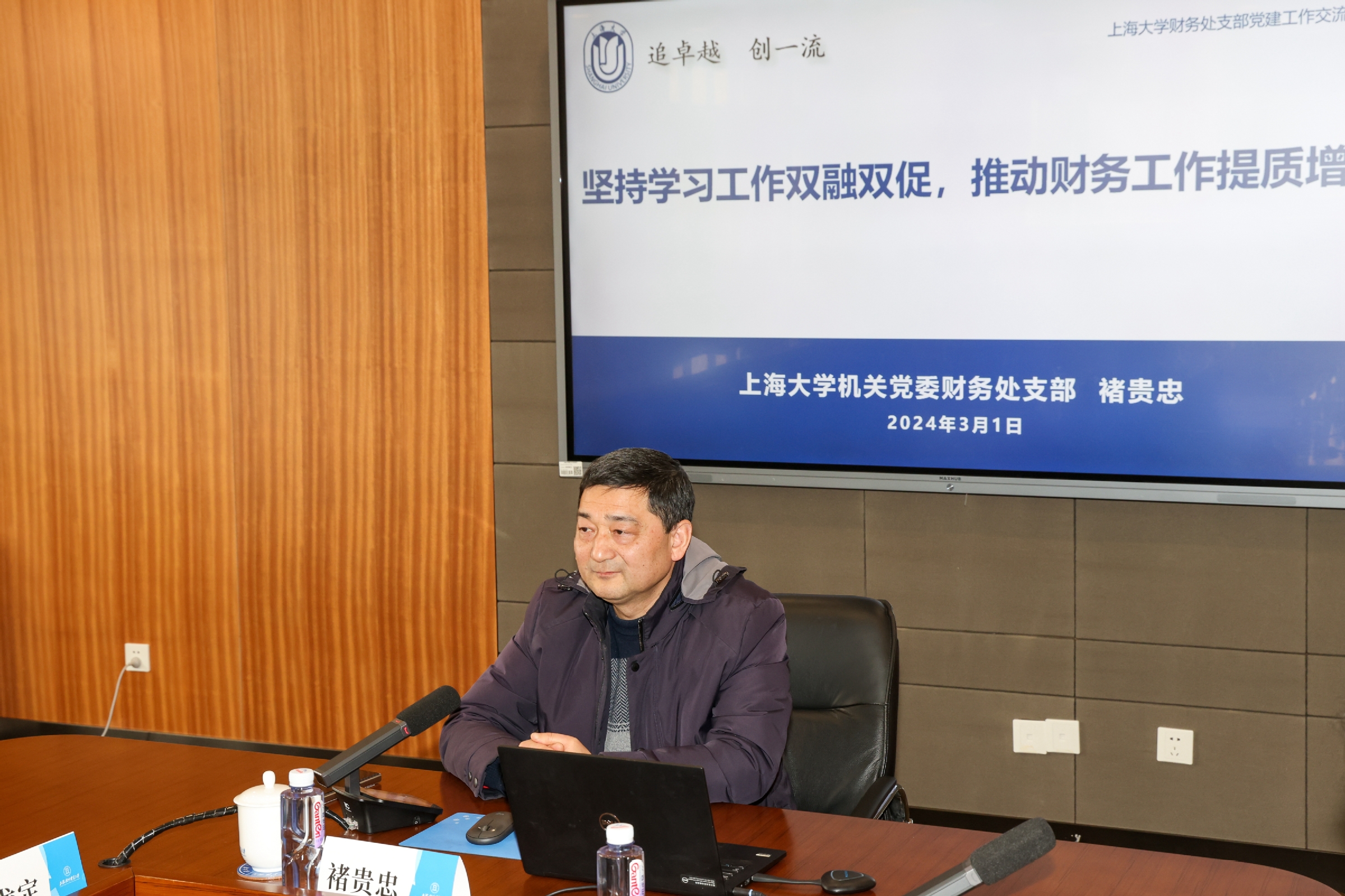 会议邀请教育部第三批全国样板党支部创建培育单位、上海大学财务处党支部书记、处长褚贵忠围绕“坚持学习工作双融双促,推动财务工作提质增效”作专题报告。与会人员就如何加强机关党支部党建与业务深度融合发展进行了互动交流。