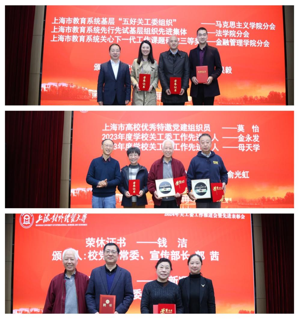 会议举行了颁奖和颁证仪式,分别为获得上海市教育系统基层“五好关工委组织”的马克思主义学院分会、先行先试基层组织先进集体的法学院分会、2023年上海市教育系统关工委课题研究三等奖的金融管理学院分会、市高校优秀党建组织员莫怡、2023年度学校关工委工作先进个人金永发、母天学颁发了奖状;为老同志钱洁、金基宁颁发了荣休证书;为郭新顺、杨亚娥颁发了聘任证书。