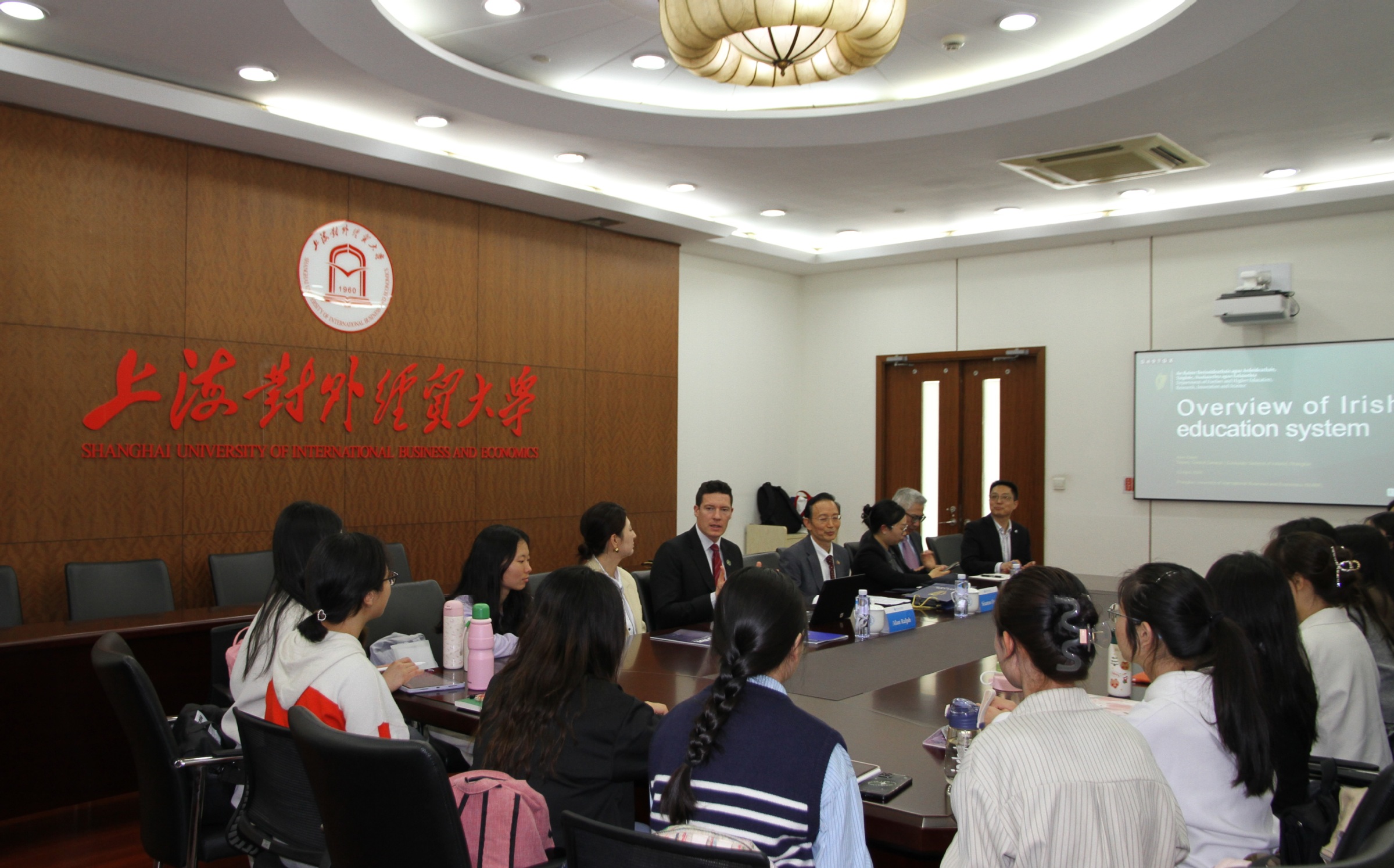 会见之后,Alan Ralph一行与必赢626net入口首页师生代表座谈,围绕国别与区域研究,聚焦“爱尔兰教育体制纵览”(Overview of Irish Education System)作交流发言,介绍了爱尔兰现代教育体系和特色。