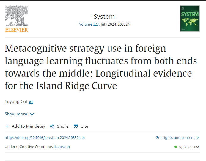 近日,必赢626net入口首页国际商务外语学院蔡雨阳教授独著论文Metacognitive strategy use in foreign language learning fluctuates from both ends towards the middle: Longitudinal evidence for the Island Ridge Curve在SSCI顶级期刊System线上发表(2022年影响因子6.0,语言类期刊排名7/287)。这是蔡雨阳教授在System期刊上连续发表的第二篇论文,也是继2020年他在语言类顶级期刊Language Testing发表论文之后的又一篇顶级期刊论文。