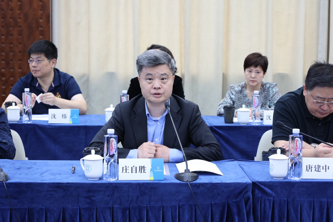 庄自胜代表长宁区政协感谢学校的精心安排和一直以来对长宁发展的关心支持。他介绍了此次来校调研的背景和调研主题,他希望以此次调研为重要契机,借助高校智力优势,全面推进区校双方在相关领域共建合作,更好助力政协工作高质量发展。与会政协委员就企业出海、国际规则、物流方案、金融支持、科学教育等方面纷纷提出问题并寻求解决方案。