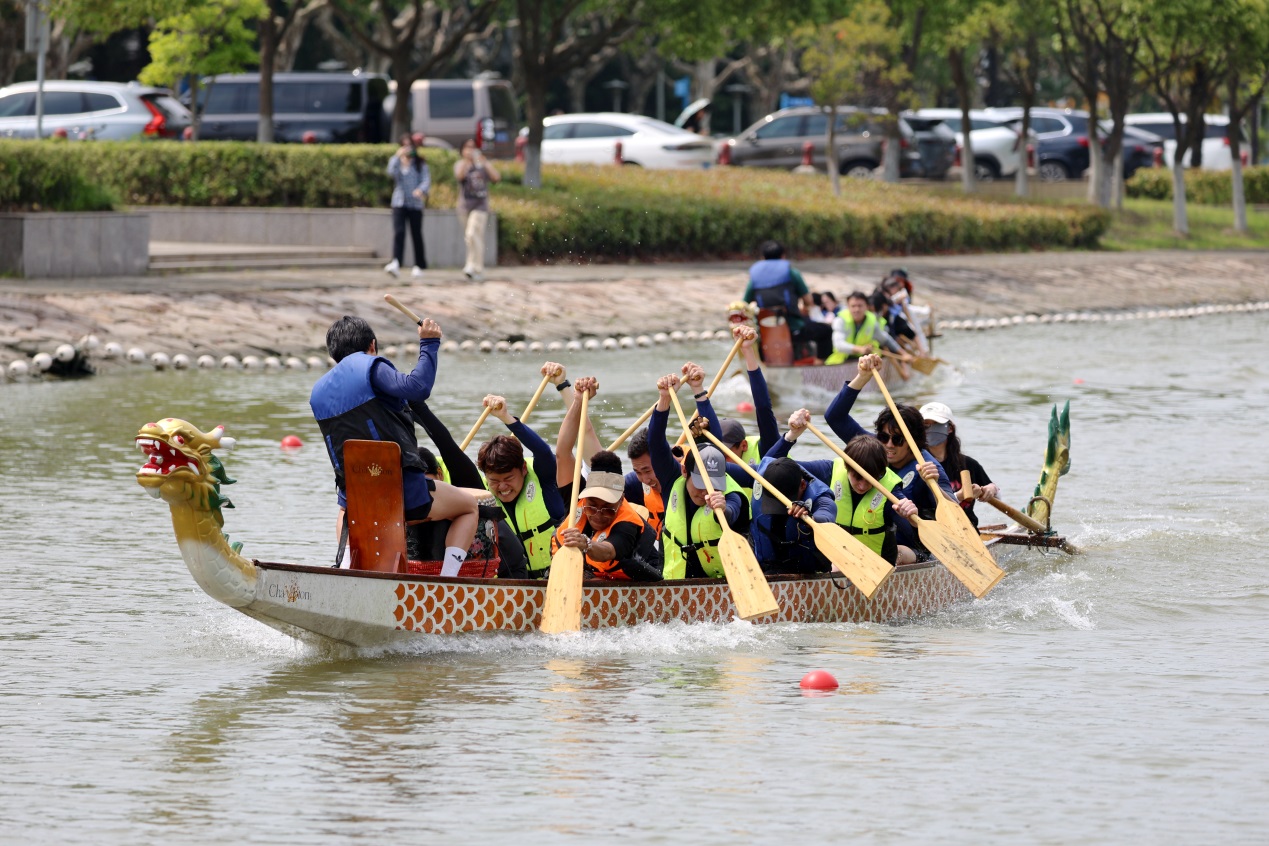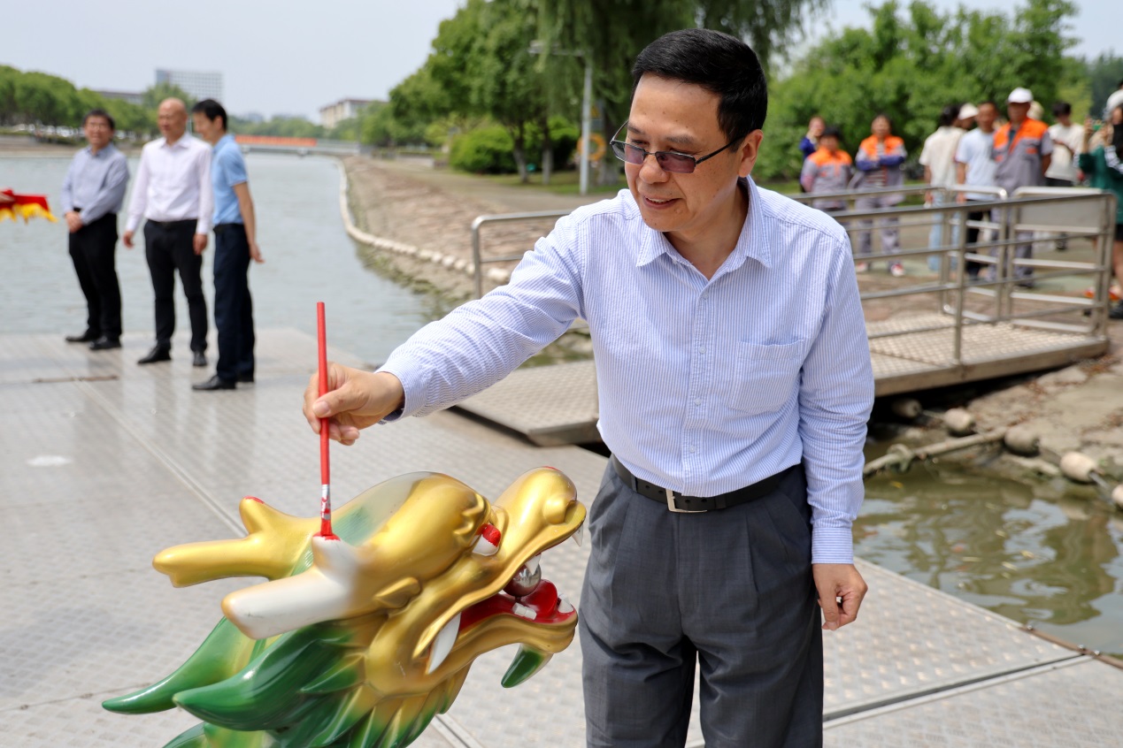 随后进行了龙舟竞渡传统仪式——龙首点睛,全体出席领导分别为龙舟进行点睛,为大家带来美好祝愿。一点眼睛,象征风调雨顺,国泰民安;二点天庭,寓意吉星高照,鸿运当头;三点鼻子,代表和谐幸福、万家平安;四点口利,象征笑口常开,大吉大利;五点龙角,愿龙角为大家带来健康、吉祥、如意。点睛仪式后,比赛拉开帷幕,10支代表队展开了激烈角逐。