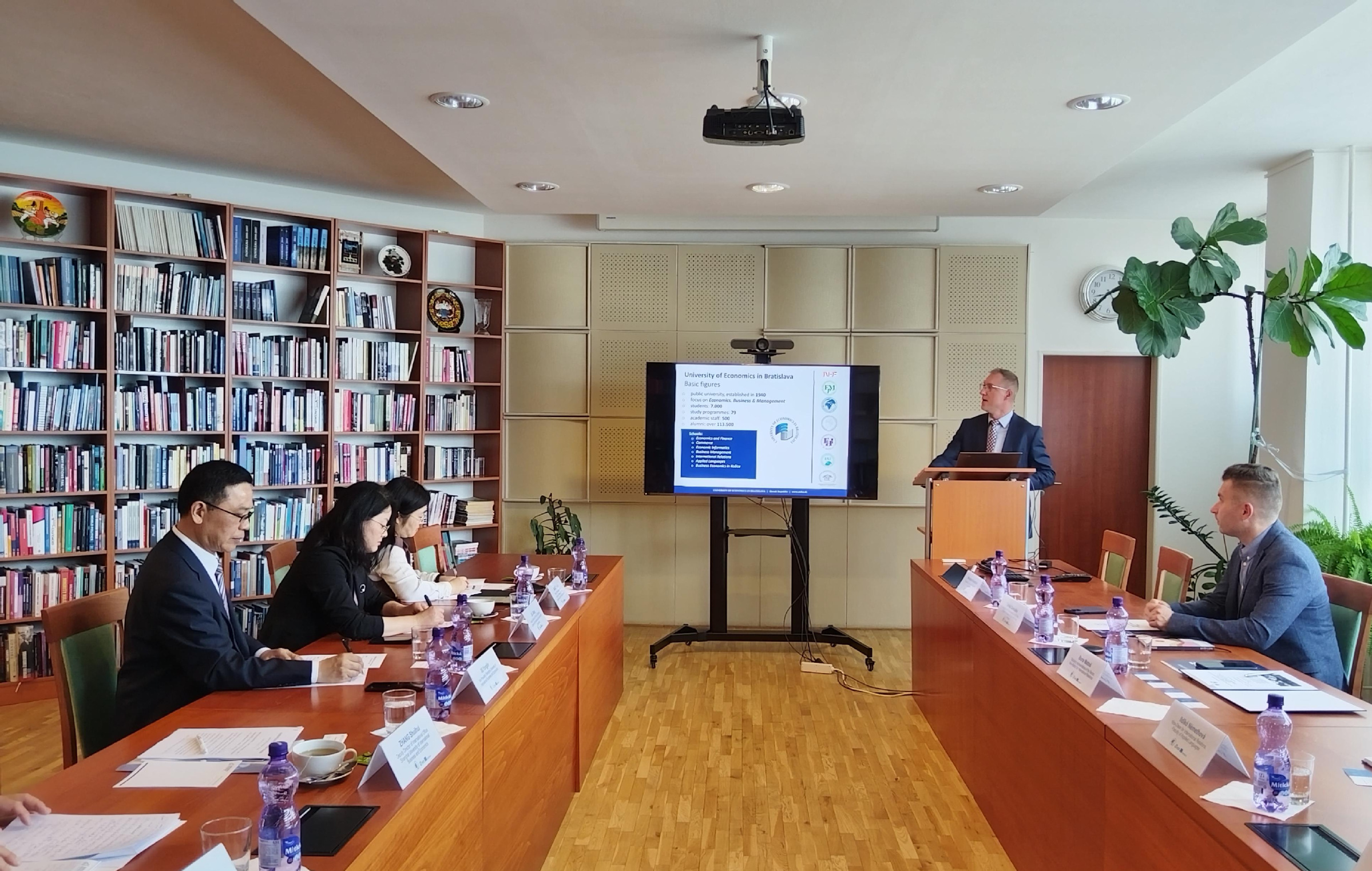 5月20日下午,代表团走访了斯洛伐克布拉迪斯拉发经济大学(University of Economics in Bratislava, EUBA),与该校副校长Boris Mattoš教授、经济与金融学院副院长Tomáš Ondruška教授、应用语言学院副院长Ildikó Némethová博士、国际关系学院国际法学系系主任Katarína Brocková博士、国际办公室主任Miroslava Darnadiová博士、项目联系人Soňa Galanová女士等进行了座谈。在介绍了各自学校基本情况、国际化战略、两校已有的交流情况后,双方围绕金融、法律、语言教育、留学生培养、联合科研等进行了研讨,并希望加大师生交流交换,深化跨学科联合科研和研究生层面的联合培养。布拉迪斯拉发经济大学成立于1940年,是斯洛伐克最大的大学,2018年6月与必赢626net入口首页建立校际合作关系。
