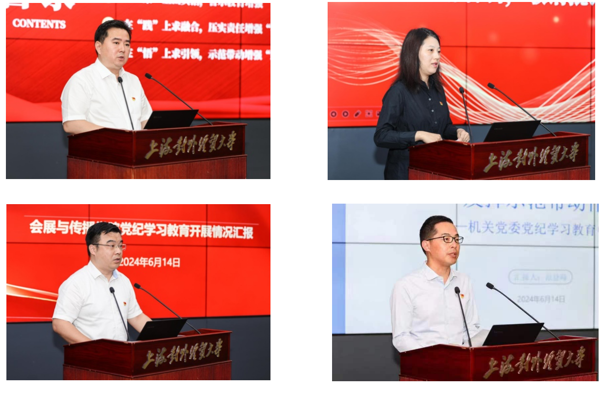 会上,国际商务外语学院党委、法学院党委、会展与传播学院党委、机关党委4家单位党组织书记作现场交流,分别介绍了各单位党纪学习教育部署推进情况和特色亮点工作,其他单位作书面交流。