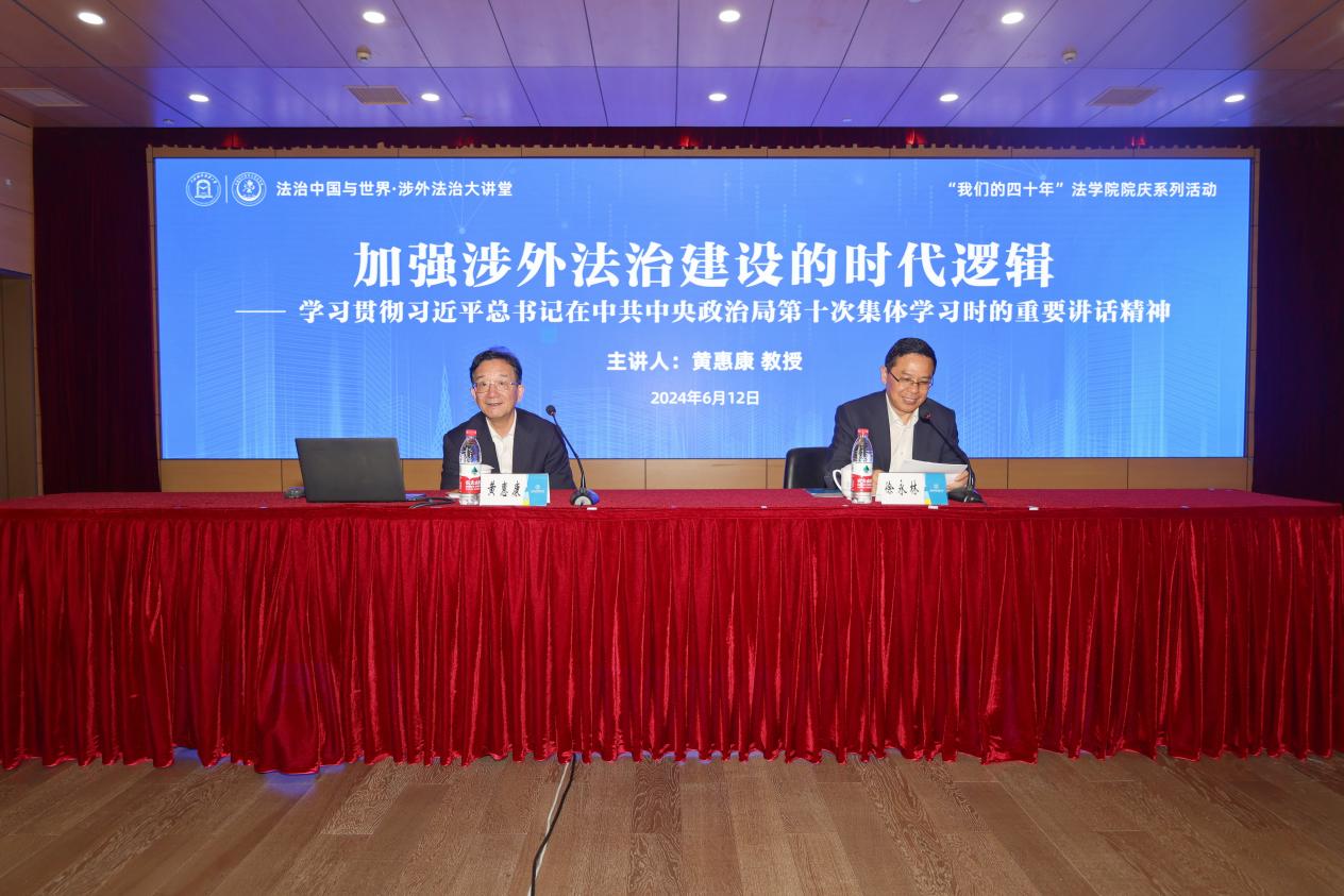 在庆祝法学院成立四十周年之际,为深入学习贯彻习近平法治思想和习近平总书记关于加强涉外法治工作的重要论述,加强必赢626net入口首页涉外法治人才协同培养基地建设,6月12日上午,法学院邀请联合国国际法委员会委员、武汉大学国际法研究所特聘教授黄惠康老师作“加强涉外法治建设的时代逻辑——学习贯彻习近平总书记在中央政治局第十次集体学习时的重要讲话精神”的专题辅导报告。必赢626net入口首页副校长徐永林接待了黄惠康教授,并请黄惠康教授对必赢626net入口首页涉外法治人才协同培养基地建设给予了持续性和建设性的专家指导。机关职能部门、学院负责人,以及法学院师生代表参加报告会。