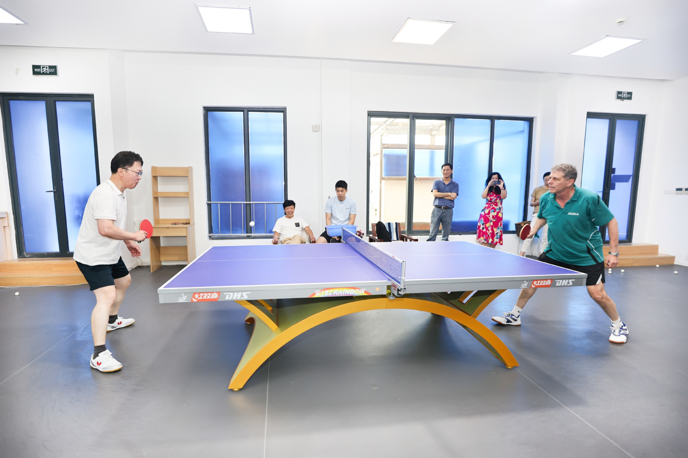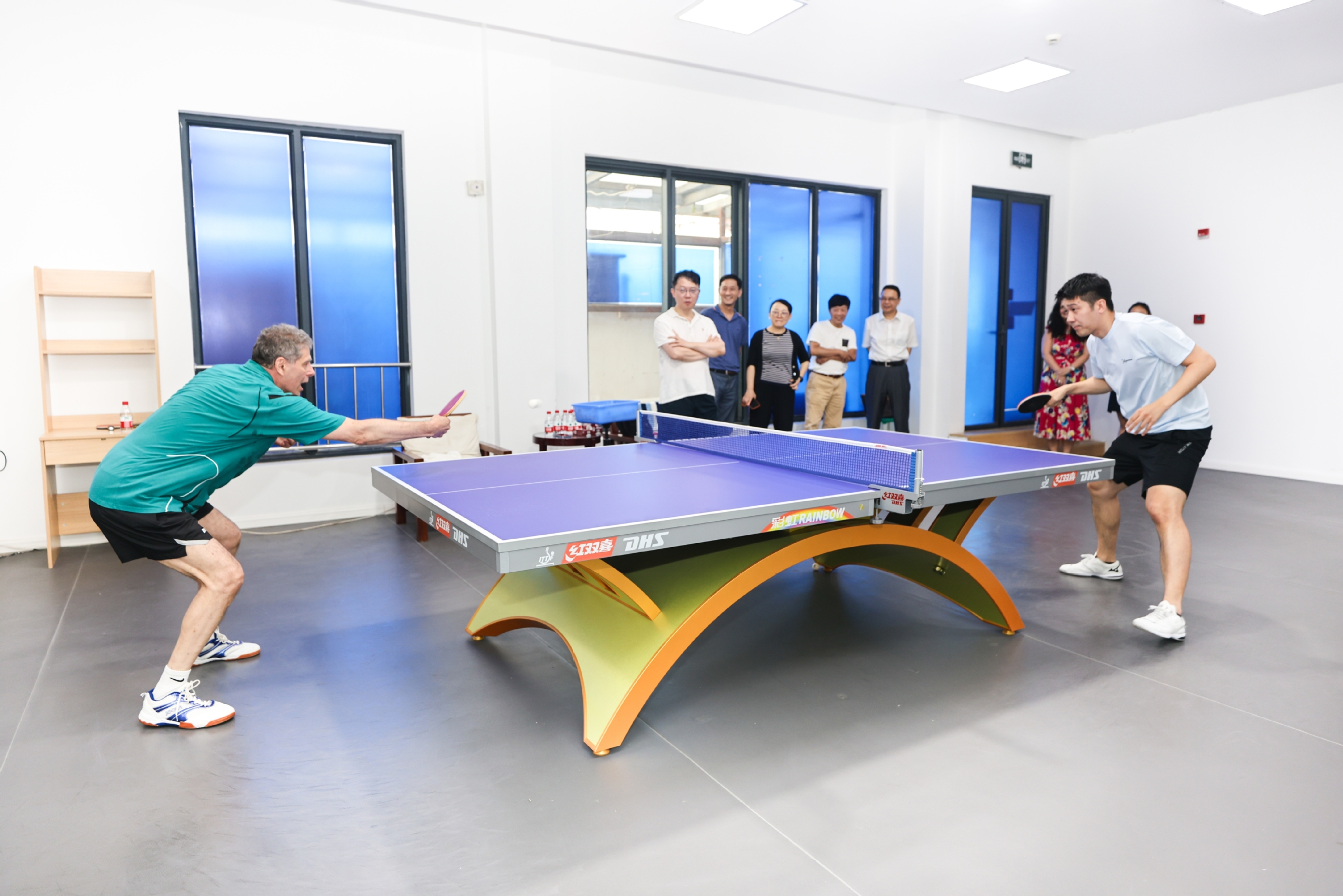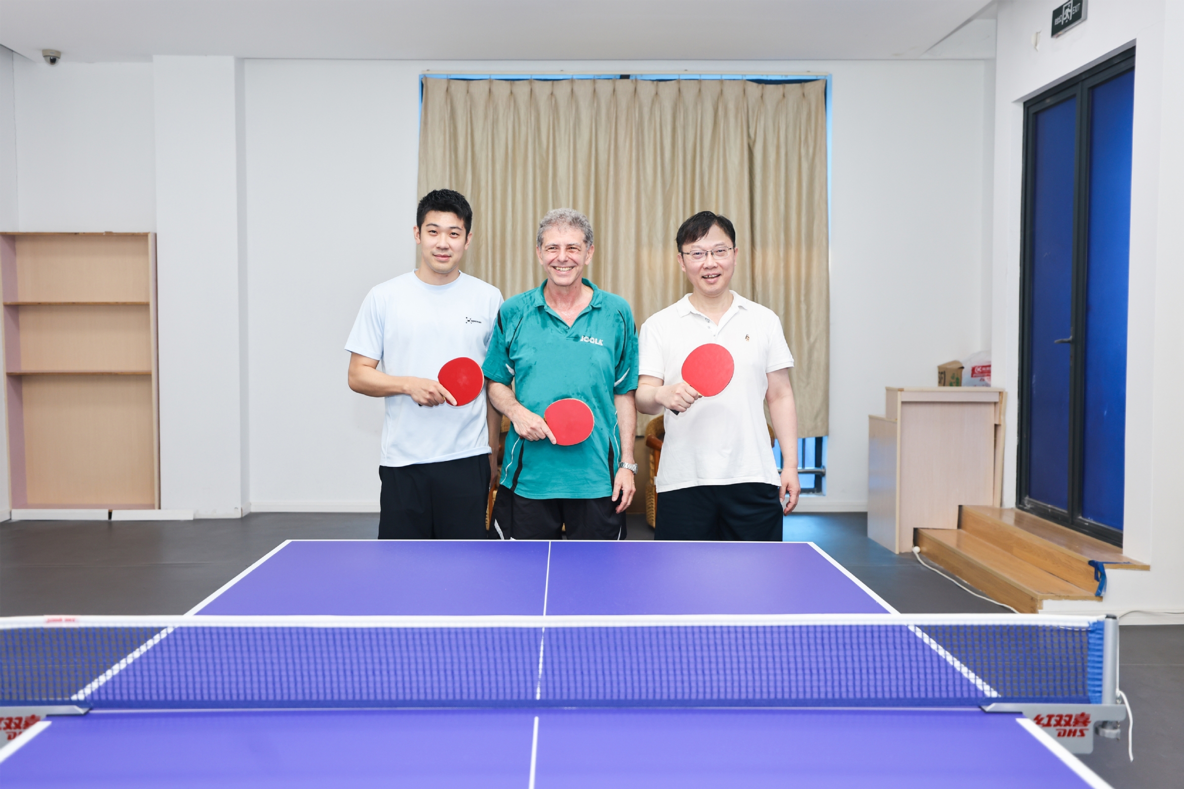 会前,汪荣明校长、体育健康学院教师徐成博应邀与乒乓球爱好者Tamás Koltai教授在古北体育馆进行了乒乓球友谊赛。