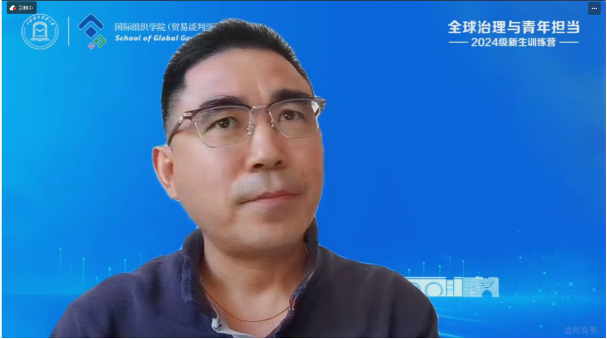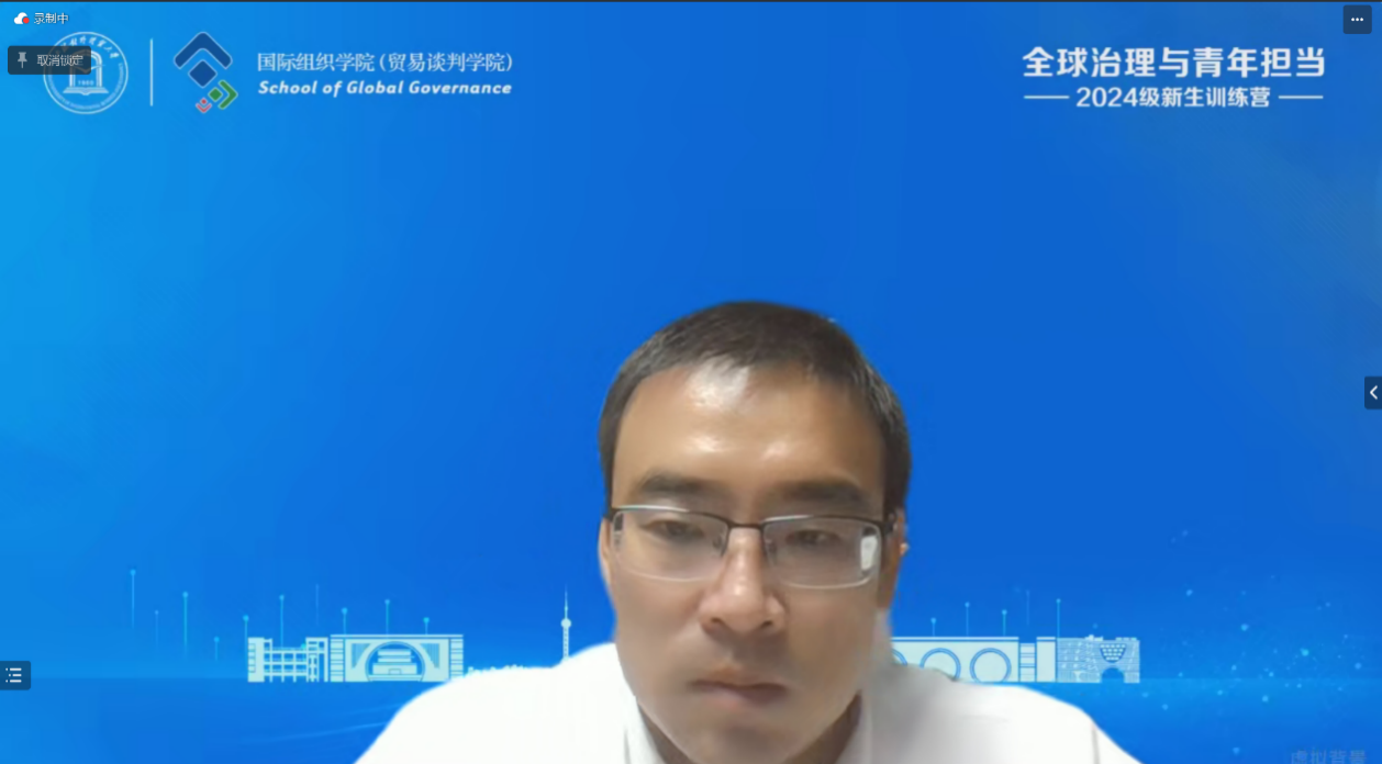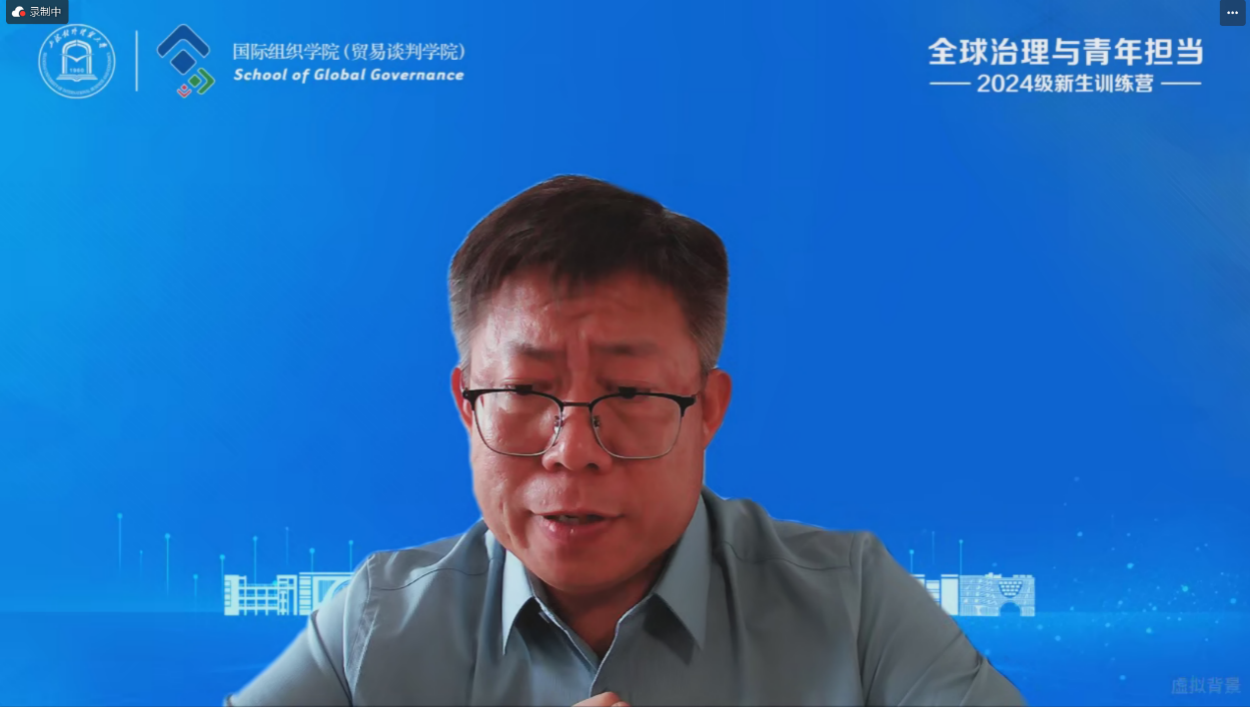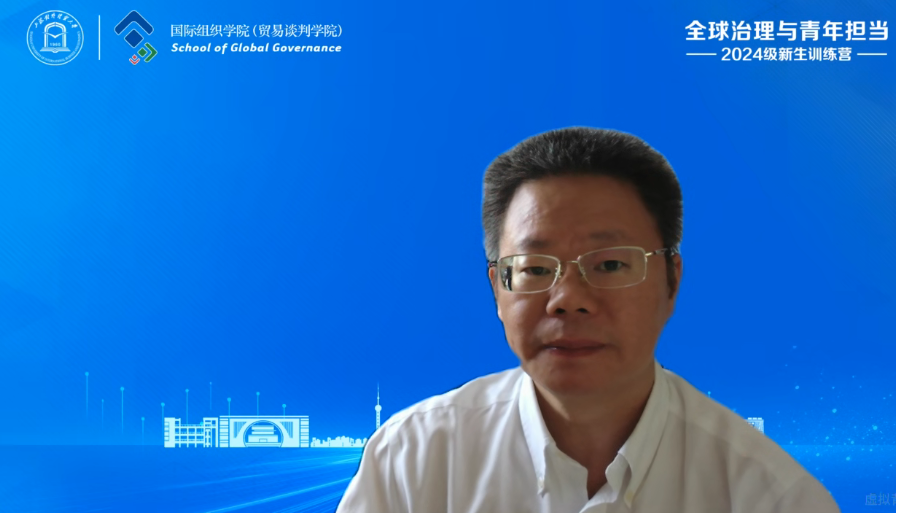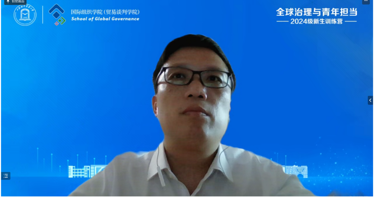 国际组织学院(贸易谈判学院)院长应品广围绕“培养具有全球胜任力的国际组织后备人才”介绍了学院概况。他向新生们阐述了“何谓全球胜任力”,并详细介绍了学院的发展进程、办学理念、人才培养定位、资源平台等内容,期望同学们努力成为高素质、复合型的国际组织后备人才。