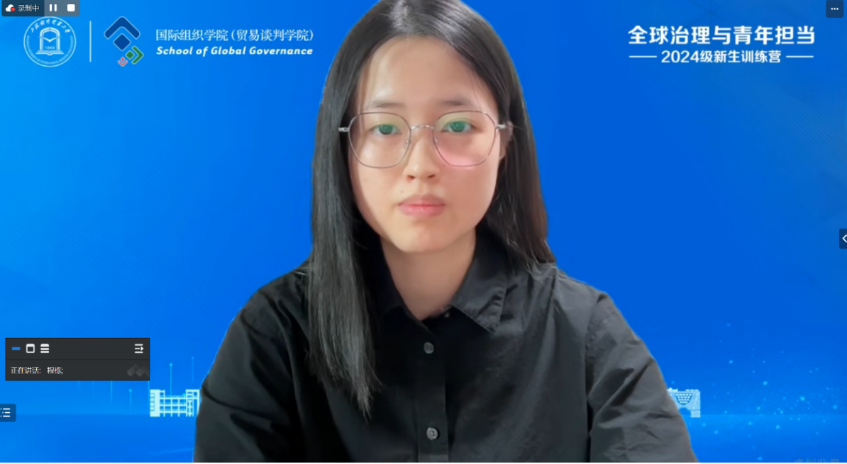 在训练营结业仪式上,2024级国际经贸规则专业本科生贺肇鲲、国际政治专业本科生冯雨滋、世界贸易组织法专业研究生陆王臻言作为新生代表交流了学习体会。他们对学院精心组织的新生训练营表示衷心的感谢,分享了自己的收获与感悟,对即将开始的大学生涯充满信心和希望,表示未来将坚定理想信念、厚植家国情怀、拓展全球视野、磨练专业本领,努力成长为具有国际竞争力的高素质人才,为国家参与全球治理做出力所能及的贡献。