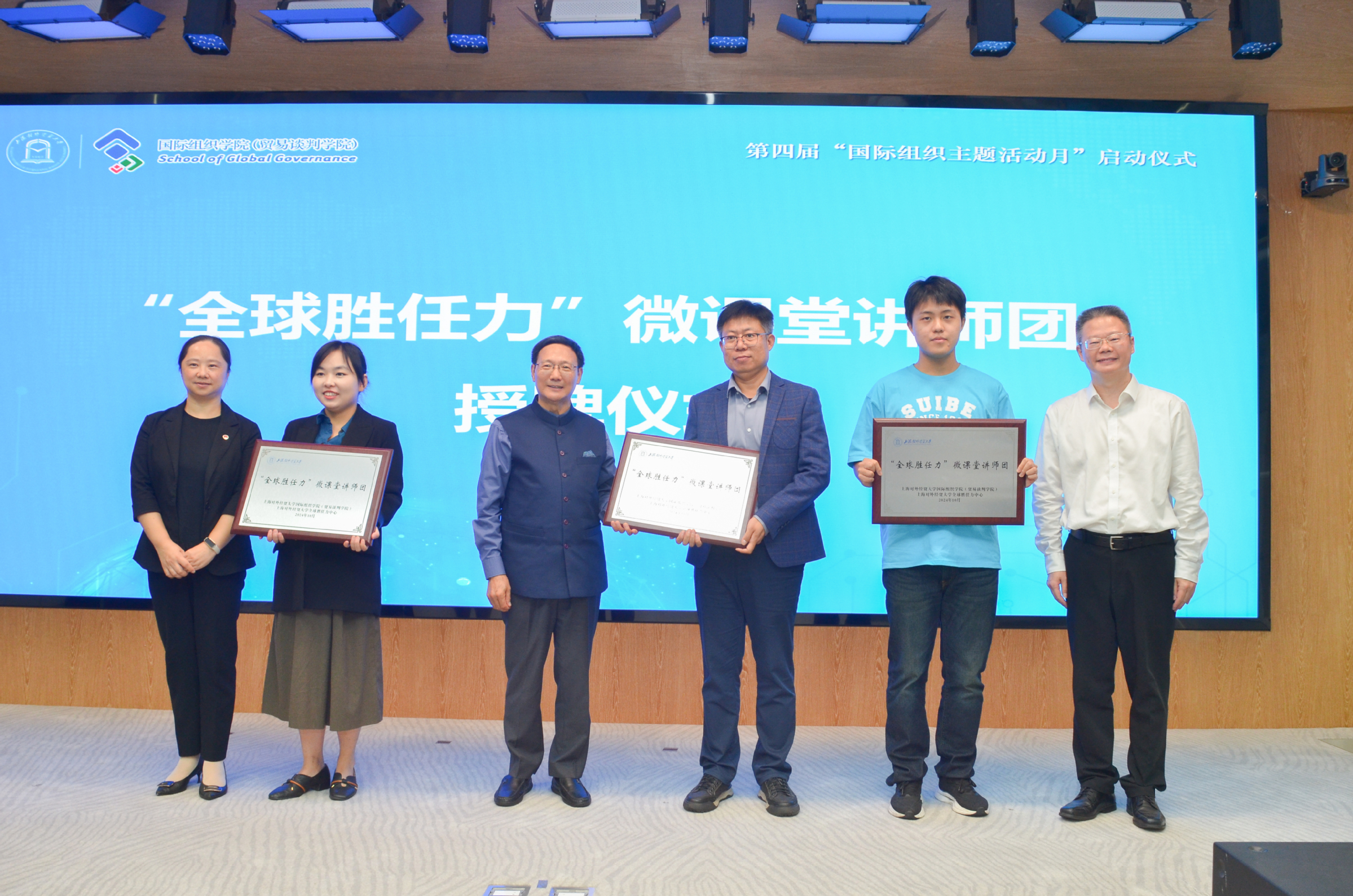 本届主题活动月创设了“全球胜任力”微课堂项目。活动遴选优秀师生组成讲师团,走进大中小学课堂开设主题微课,进行知识普及和宣讲,把国际视野的拓展、全球胜任力的培养融入大中小思政一体化的课堂和实践中。章益国、李碧建、郭茜共同为讲师团师生代表授牌。