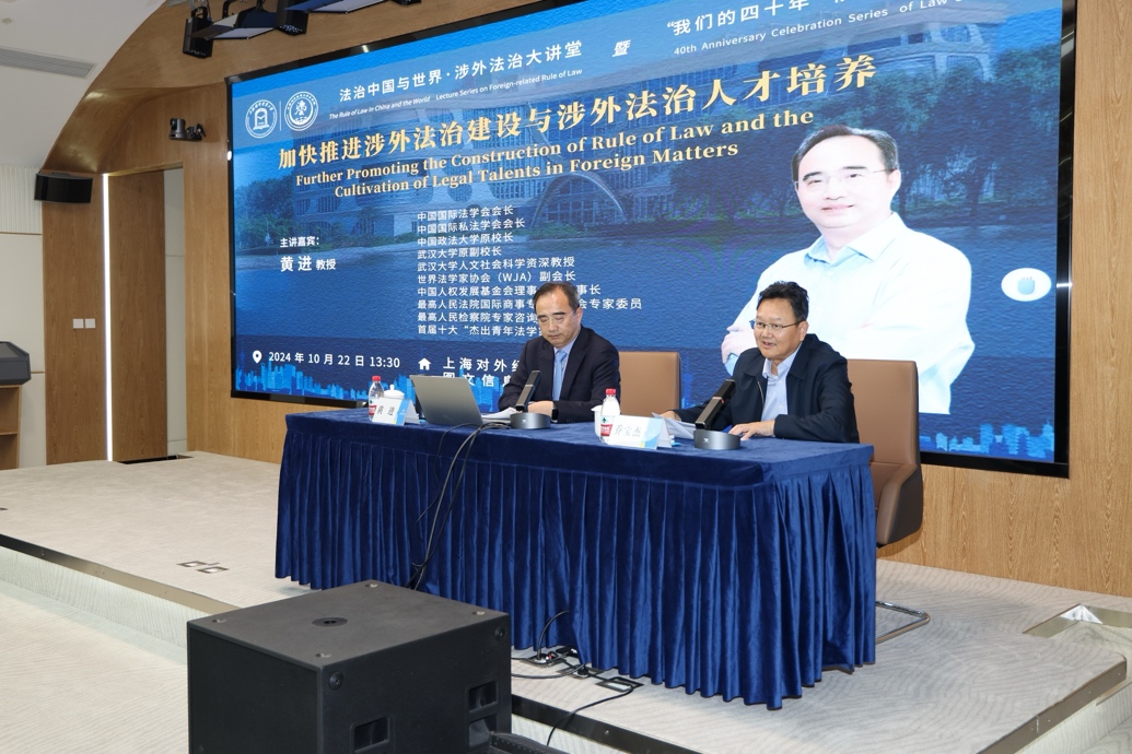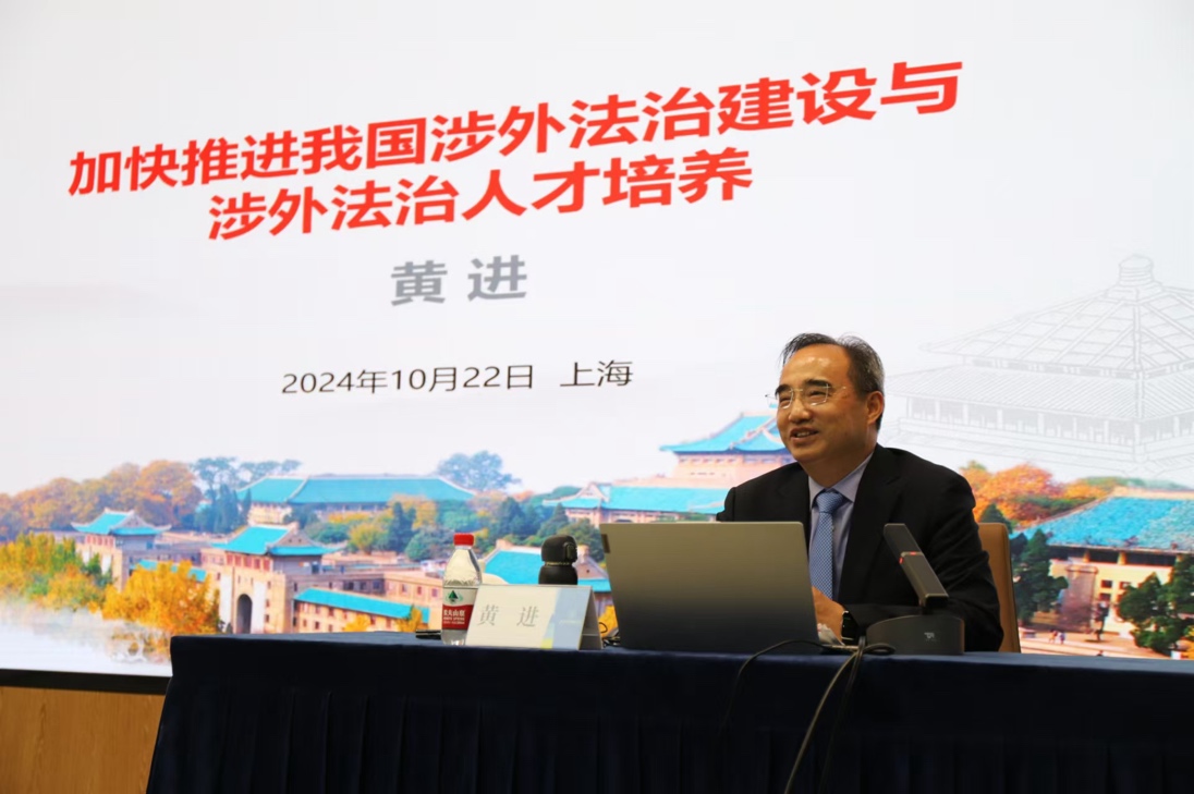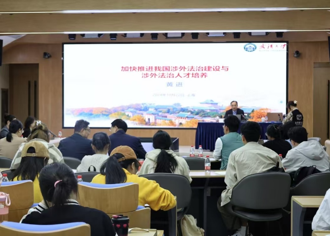 讲座中,黄进教授结合自身丰富的国际法学研究和实践经验,对涉外法治建设的重要性进行了深刻解读和详细阐释,强调涉外法治工作事关中国全面推进依法治国,要坚持统筹推进国内法治和涉外法治,加快涉外法治体系和能力建设。他从我国对涉外法治认识和实践的历史脉络,深刻认识坚持统筹推进国内法治和涉外法治等重要论述提出的时代背景,准确理解国内法治、涉外法治和国际法治概念及其辩证关系,加快推进我国涉外法治体系和能力建设的重大意义和根本目的,涉外法治在中国特色社会主义法治体系中的地位和作用,加快推进我国涉外法治体系和能力建设的实现路径,在推进高水平对外开放中如何开展涉外法治工作,在走向国际社会中如何开展涉外法治工作,加强高素质涉外法治人才培养和队伍建设,坚定法治自信、加强中国法治的国际传播等十个方面,全面阐述了加强涉外法治建设的时代逻辑。黄进教授指出,加快推进我国涉外法治体系和能力建设,要坚持立足中国涉外立法、执法、司法、守法和法律服务实践,诠释、解读、剖析中国涉外法律法规及相关涉外法治实践,并同外国和国际实践进行比较分析,探讨中国涉外法律法规的准确适用,探索中国涉外法治建设的规律和优化发展之路。黄进教授提出,涉外法治体系和能力建设是全面推进依法治国和法治中国建设的必修课,是涉及面广、联动性强的系统工程,是永远在路上并循序渐进的长征,也是求真向善至美的文化苦旅。黄进教授勉励参会师生们,适逢新时代应当尽力而为,砥砺前行,奋发图强,久久为功,力争为中国涉外法治建设贡献一份力量。