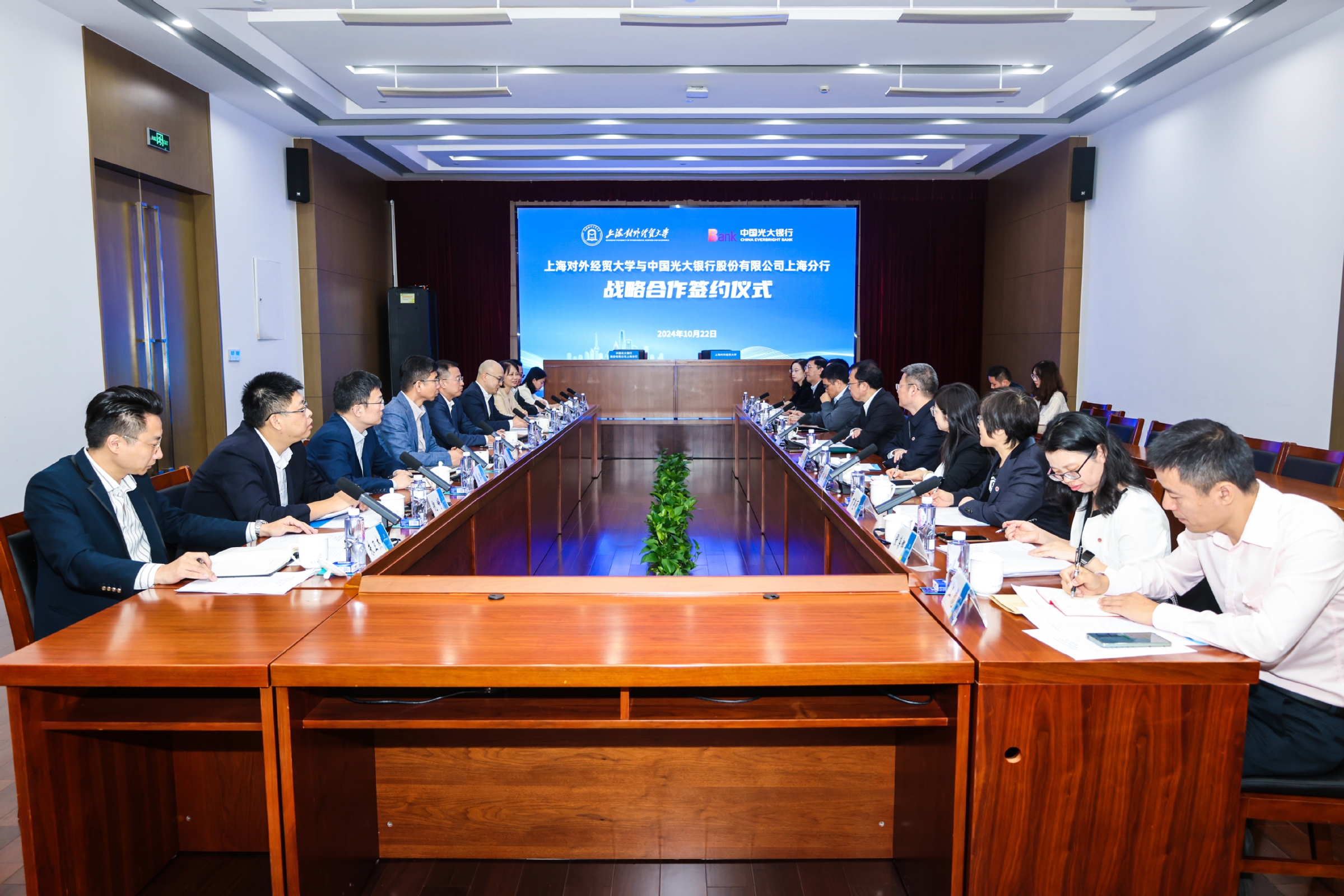 汪荣明在讲话中对光大银行领导来访调研并见证签约表示欢迎,对银行给予学校发展的持续关心和大力支持,特别是搭建的资源共享、深化综合改革、探索银校合作新模式的宝贵平台表示感谢。他表示,光大银行上海分行深度融入上海“五个中心”建设,在科创金融等领域开拓创新、成绩斐然。双方在校企资源互通共享,双向赋能平台构建,产教融合人才培养等方面有着广阔的合作空间。期待以此次战略签约为契机,把企业的优质资源引进来,把共建“数字”品牌打出去;让产业的变革、企业的需求走进来,让学校的智力服务走出去;将社会的广阔机遇迎进来,将具有“外”“经”“贸”特色的全球经贸治理人才送出去,努力打造相关领域产教融合“新范式”。