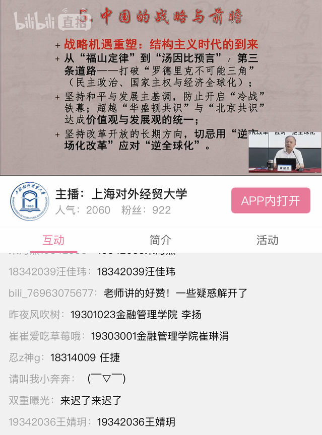 为迎接学校60周年校庆,进一步丰富防疫期间研究生学术生活,6月10日下午,研究生院校庆系列活动“学术中国”(第一季)首场讲座在学校哔哩哔哩平台直播开讲。研究生院院长、国际经贸学院院长,博士生导师黄建忠教授作了题为“‘疫情热’下中国开放经济的‘冷思考’”的学术讲座。讲座由党委研工部副部长、研究生院副院长乔檀主持。2000多名师生在线观看了本场讲座。