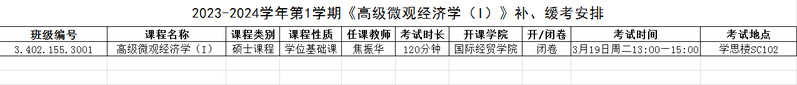 2023-2024学年第1学期《高级微观经济学(I)》补、缓考安排